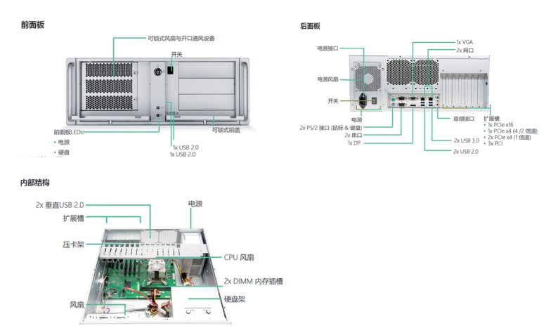 | 显示性能 | 芯片组 CPU 内存 显示 硬盘 网络 扩展 COM USB I/O前面板接口 I/O后面板接口 音频 电源 机箱尺寸 整机重量 支持系统 散热形式 湿度范围 温度范围 | IntelH420E芯片组 Intele Corei7 10700 8核 主频 2.9GHz 睿频 4.8GHz 8G DDR4 1个VGA接口、2个HDMI接口 1T SSD 双千兆 Intel219-LM(10/100/1000 Mbps)、1个Inteli225-V(10/100/1000/2500 Mbps) 1个PCleX16插槽、1个PCleX4插槽、5个PCI插槽 6个COM口(2个RS232/422/485) 4个USB3.2 Gen.1 接口、4个USB2.0接口、1个内置USB2.0接口 2个前置USB2.0接口 1个AC IN,1个PS/2接口,1个VGA接口、2个HDMI接口、2个RJ45网口、3个音频接口6个COM、4个USB3.2 Gen.1接口、2个USB2.0、、1个LPT接口 Line-In,Line-Out, MIC 300W额定功率(可更换550W电源) 482*480*177mm(宽*深*高) 约16KG Windows10、Linux 铜导主动散热 湿度:10 ~ 95% RH @ 40°C,非凝结 操作:-10~50°C;存储:-20~60°C 操作:-10 ~ 50℃;存储:-20~60°C |